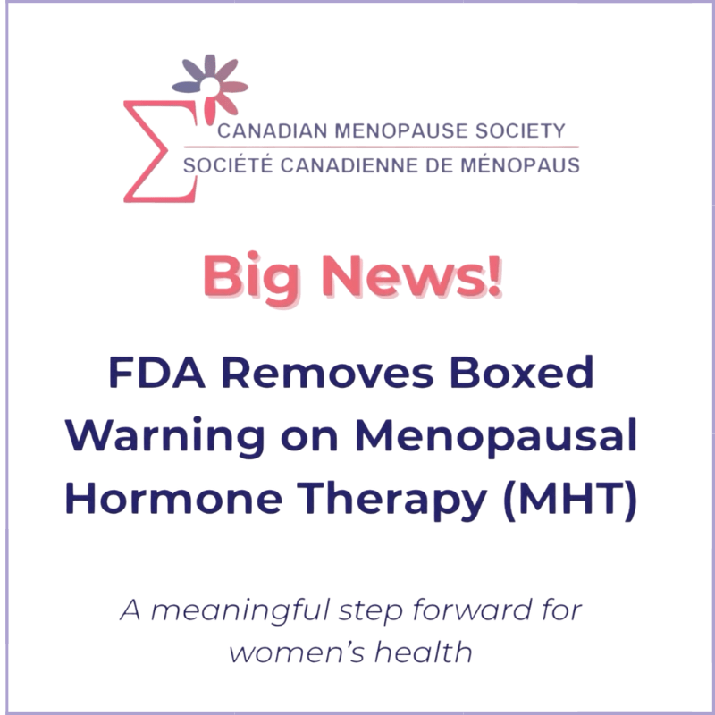 The Canadian Menopause Society applauds the FDA’s decision saying it reflects updated science that will give women better info about hormone therapy safety, especially if they start taking it before they’re 60 or within 10 years of menopause. Getting rid of the warning is a long-overdue correction that supports better care. LEARN MORE